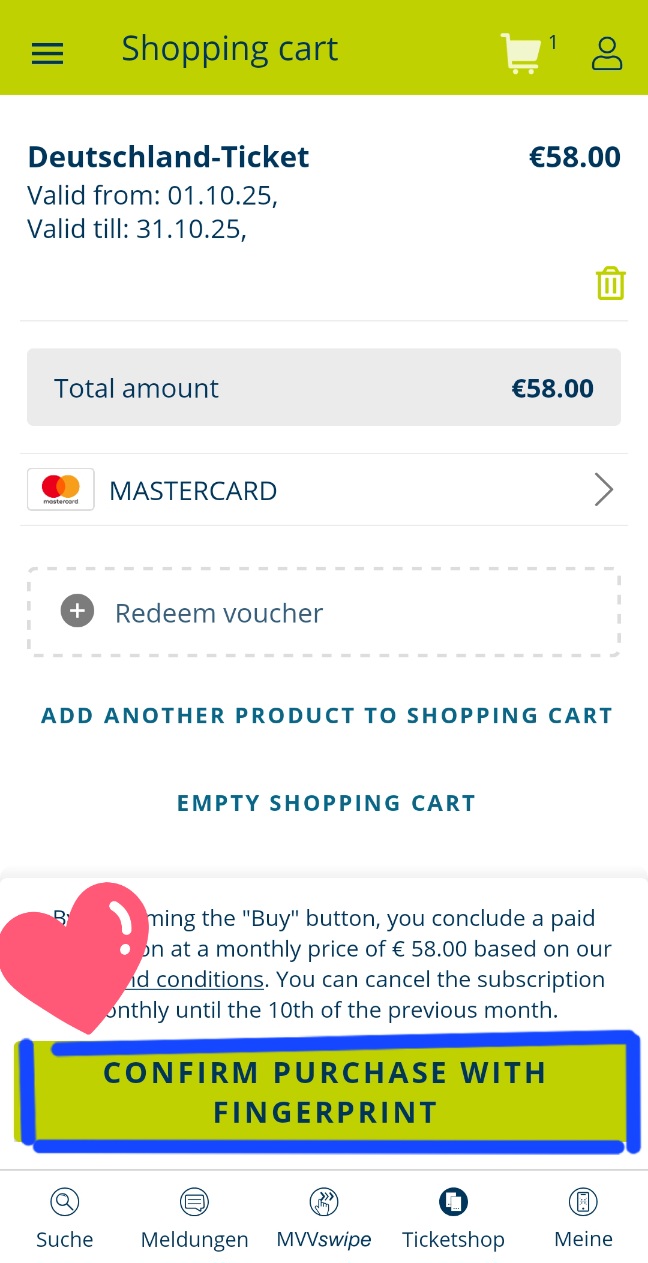 DB Navigator는 신용가드 구매가 불가하고 독일 내의 은행계좌가 있어야지 구매가 가능하여 저는 MVV- App을 사용하여 구매했습니다.