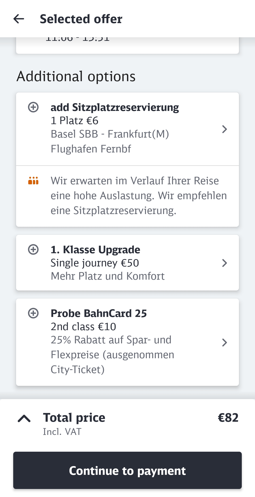 이렇게 하면 Bael SBB -> Frankfurt(M)flughafen 으로 가는 티켓을 구매하게 된 거예요