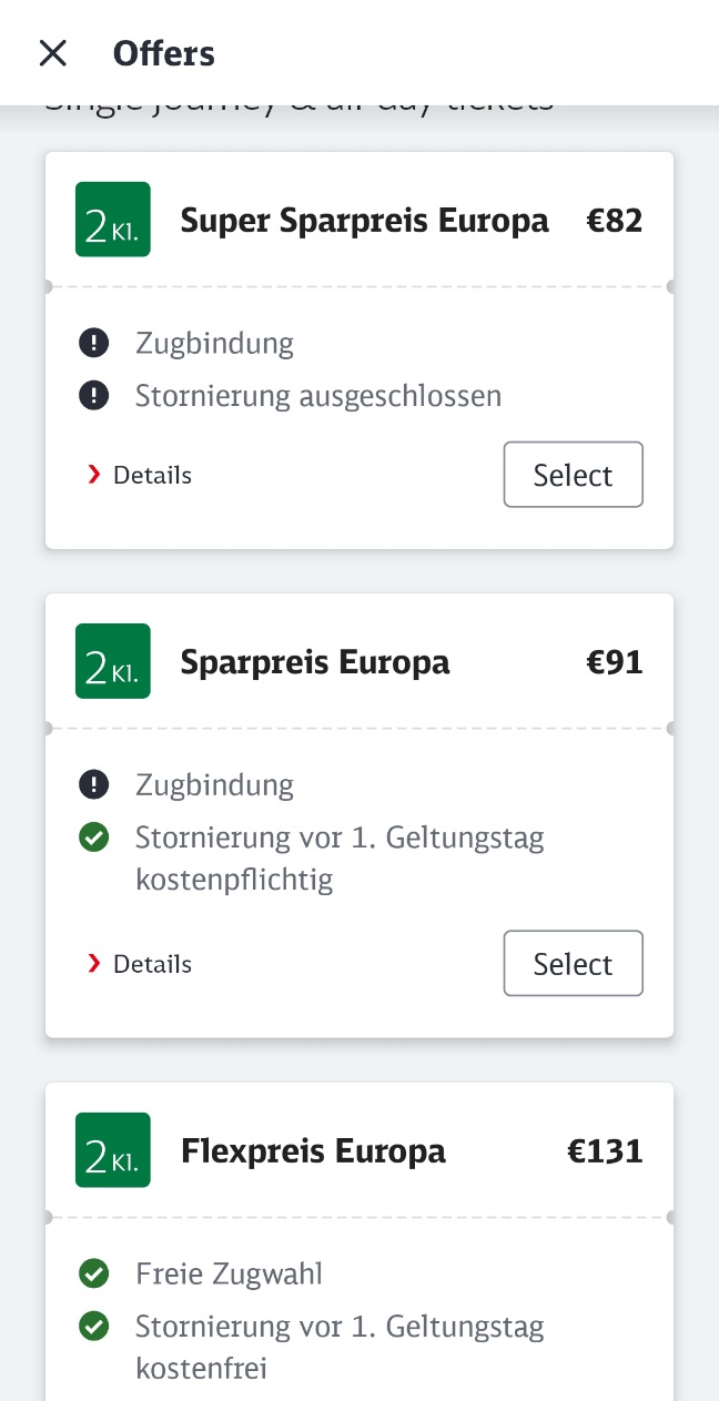 Super Sparpreis Europa : 가장 저렴한 가격의 티켓으로, 날짜와 시간 변경이 불가능하고 티켓 취소가 불가능합니다.